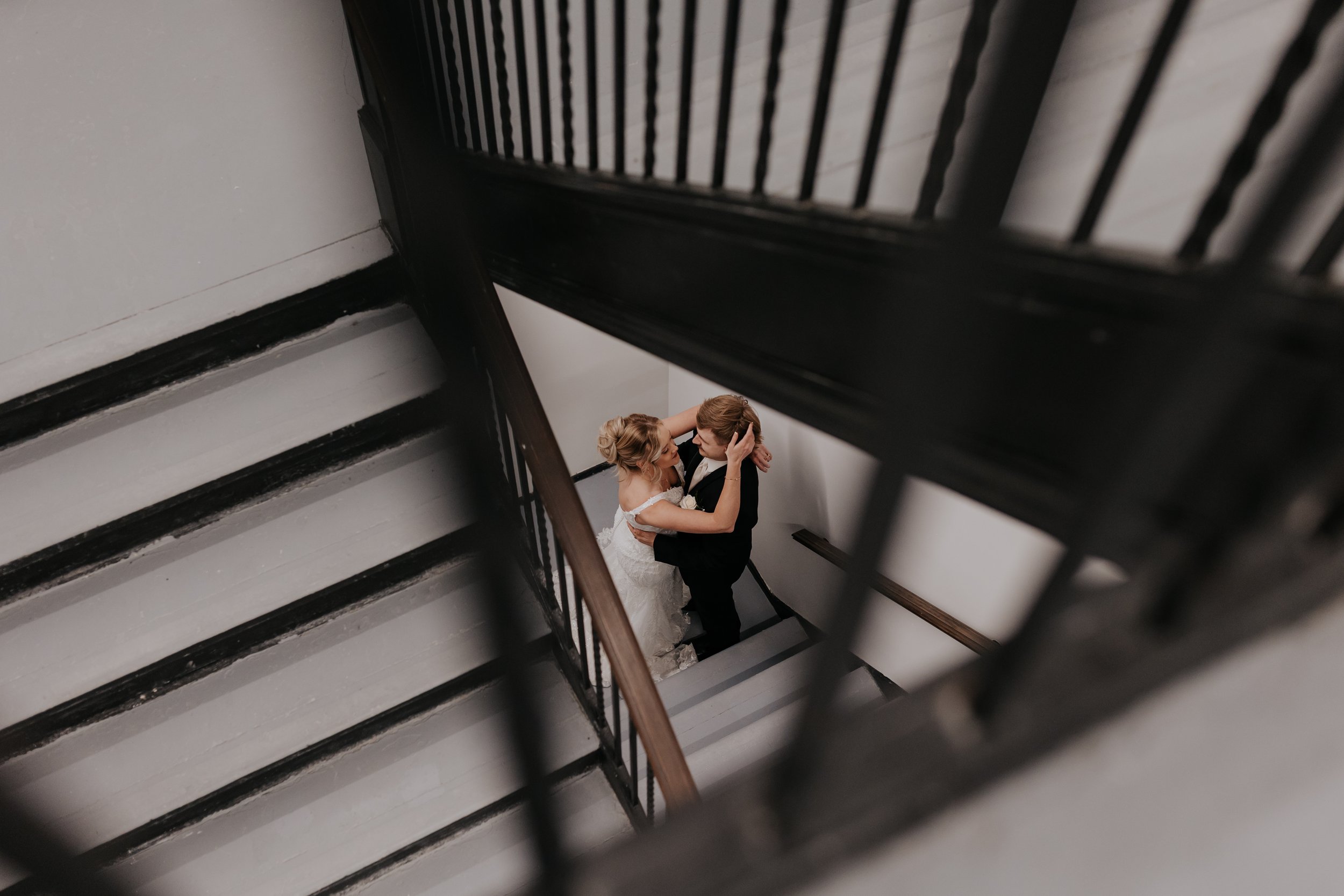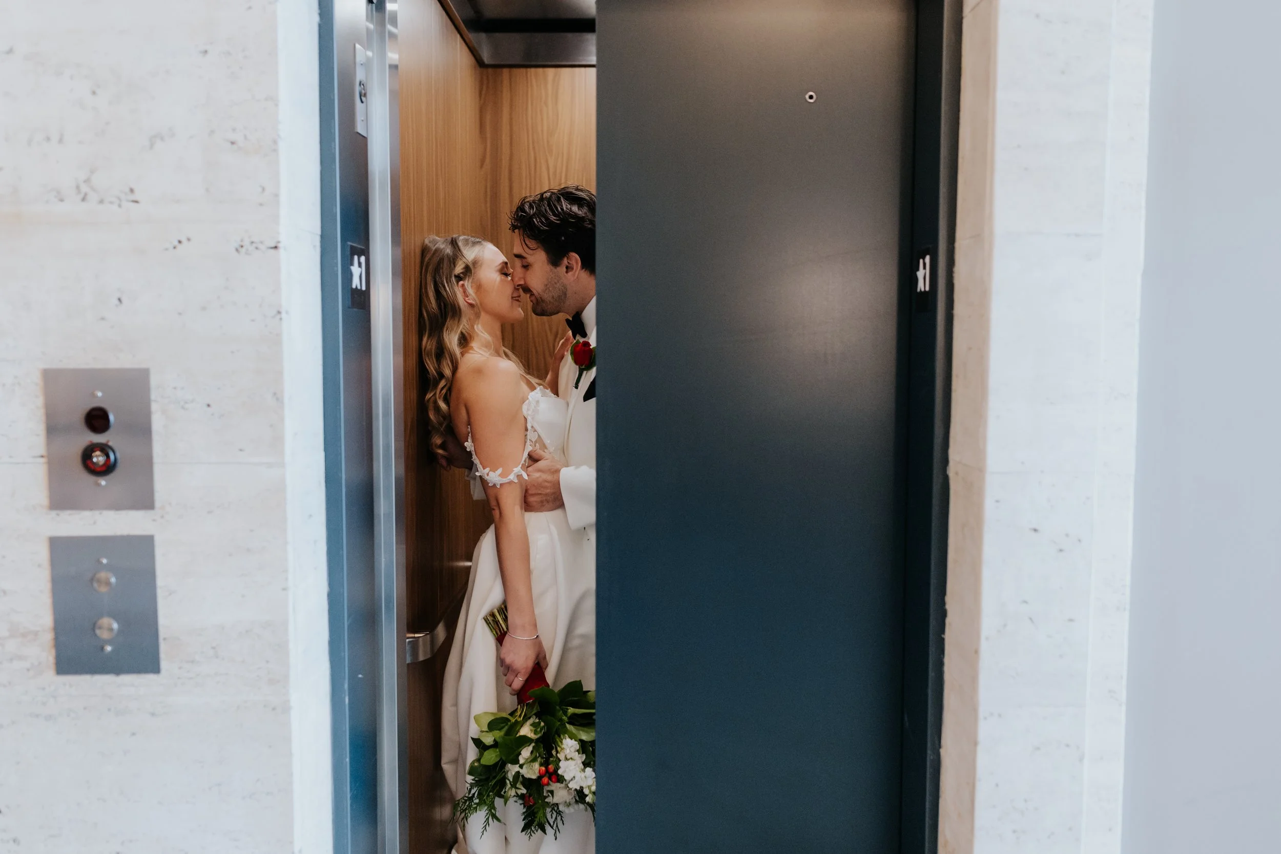 The elevator inside this historic Hammond, Indiana wedding venue gives off modern editorial energy, and is perfect for a playful just-married moment.